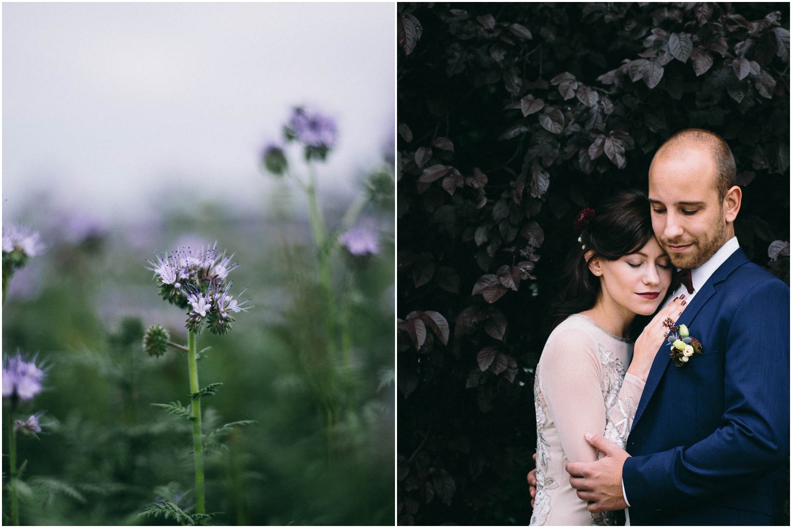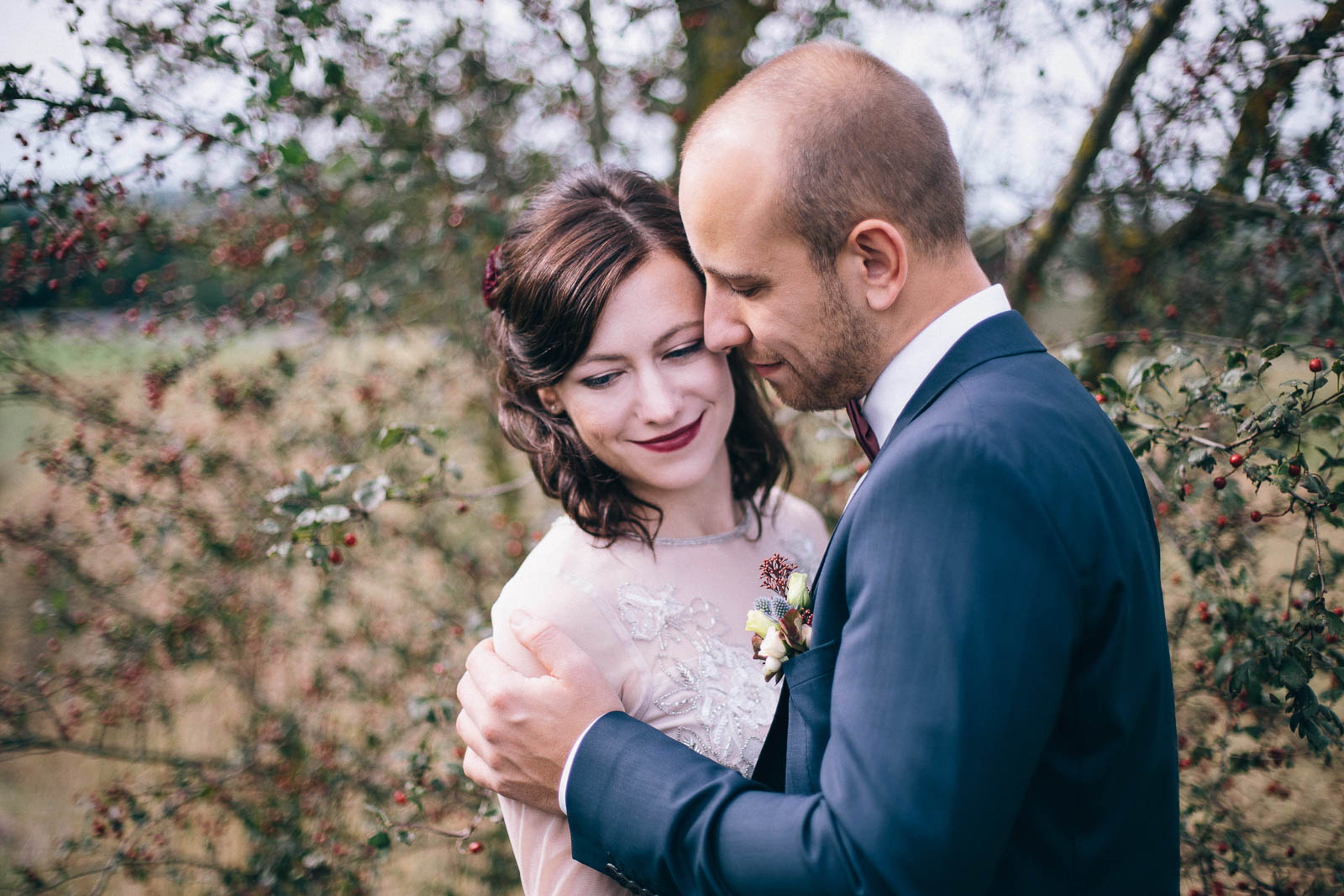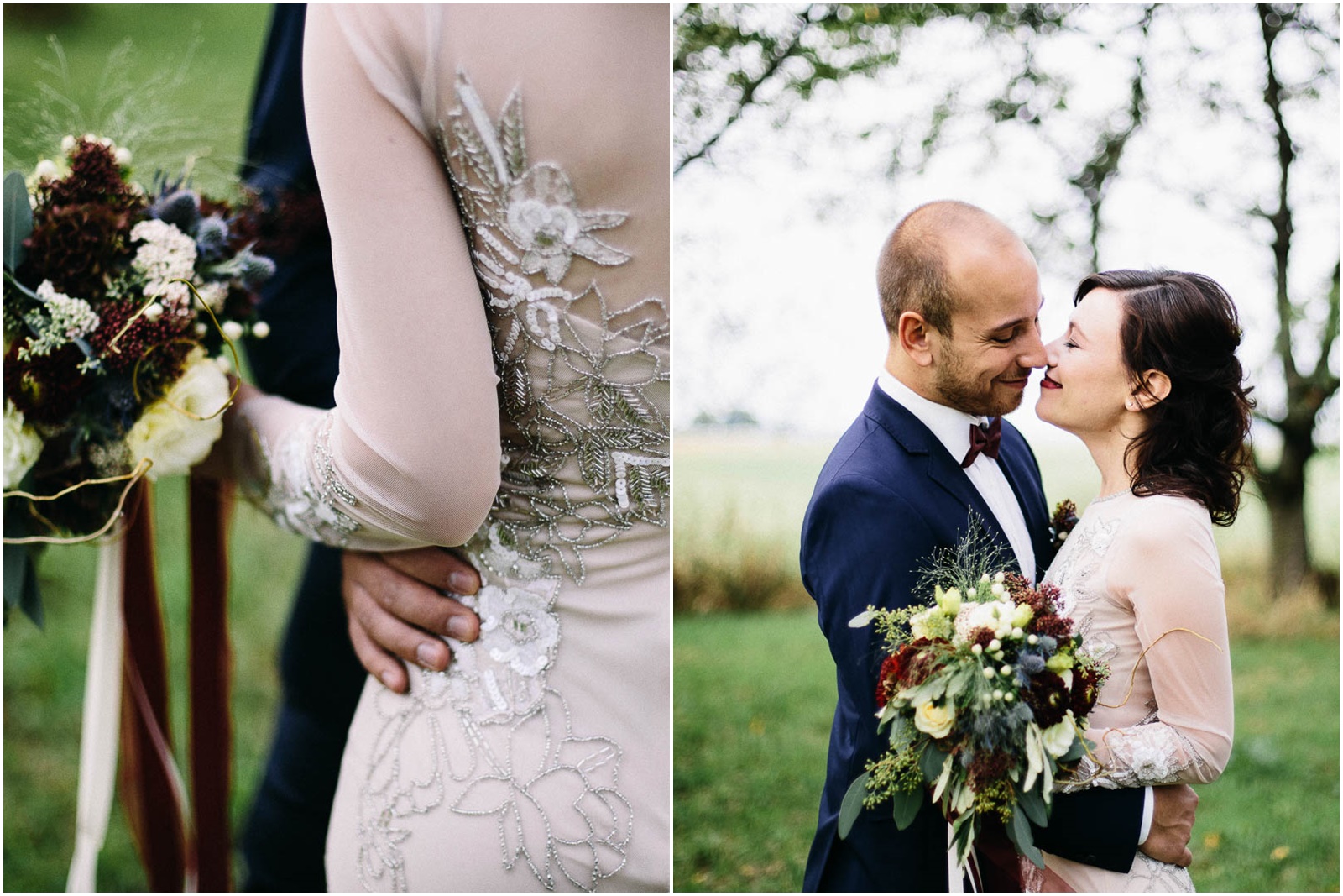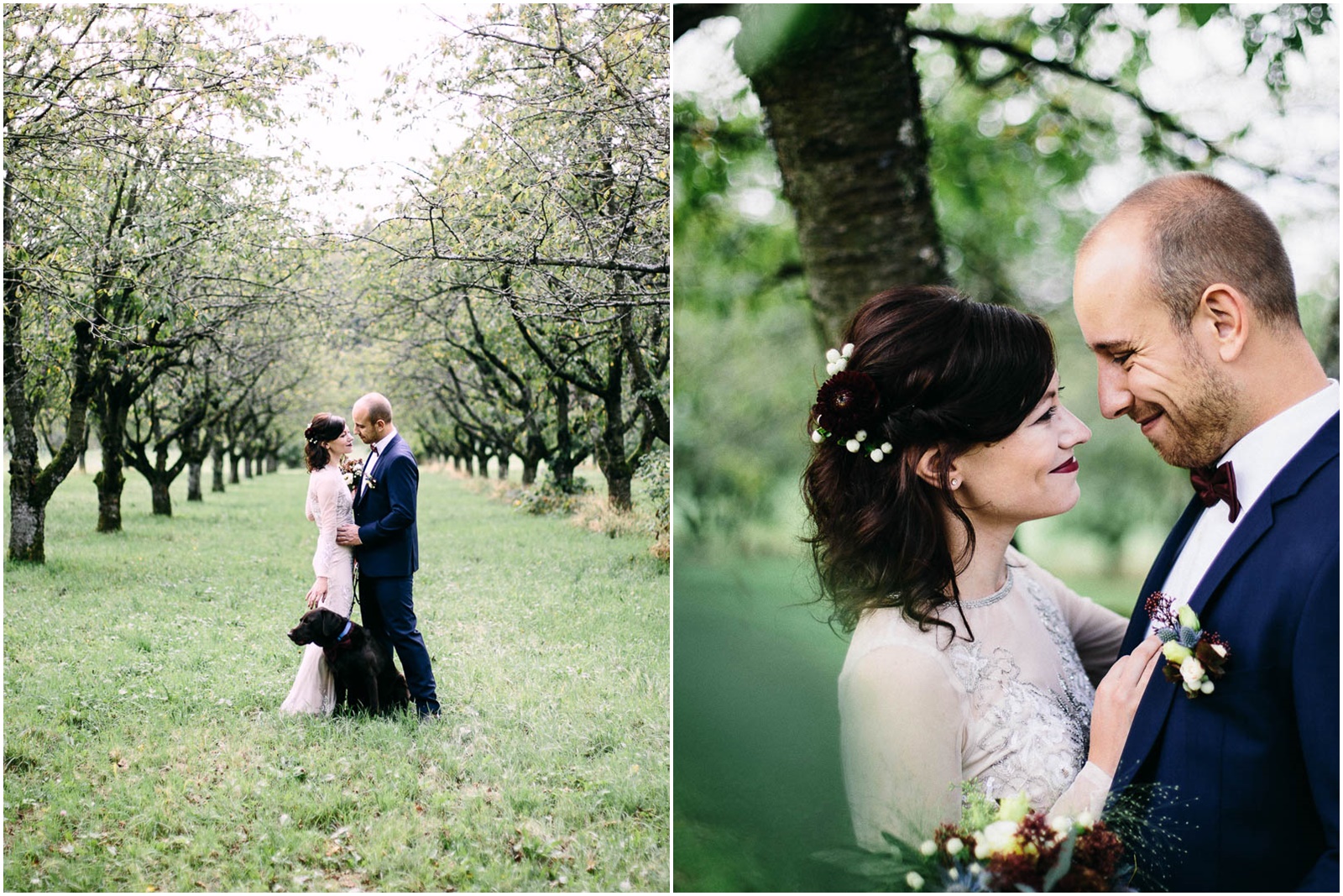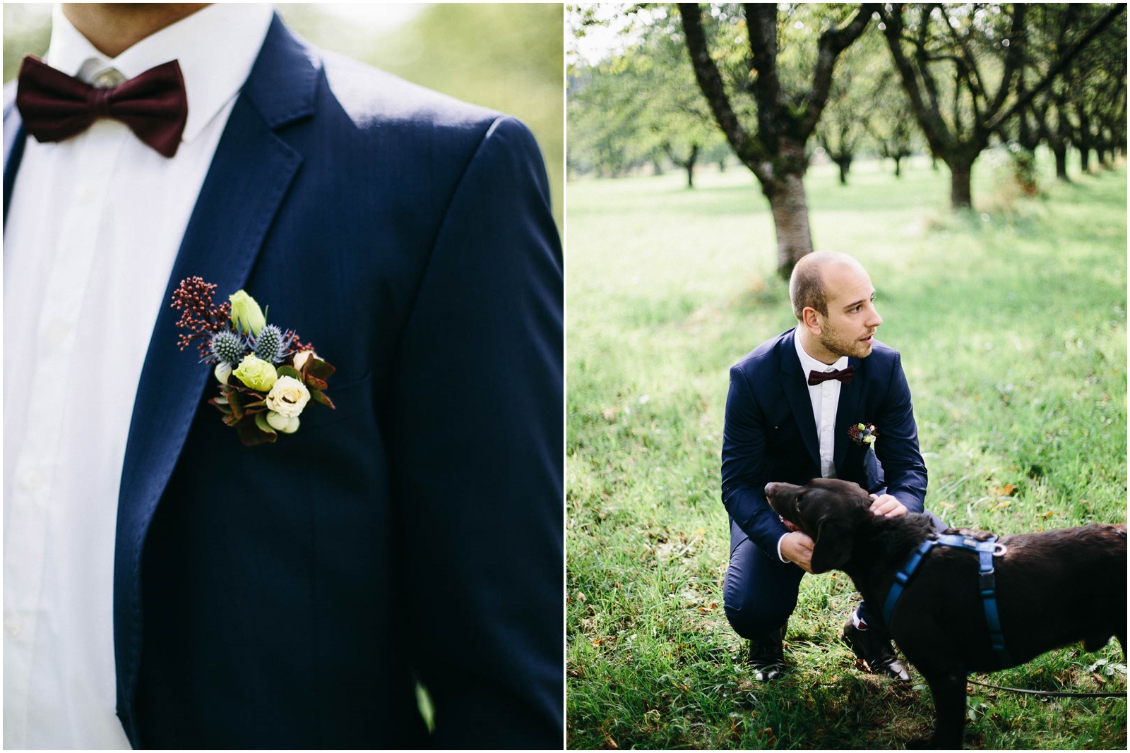 Ein Hochzeitsshooting mit Hund stellt einen vor gewisse Hürden: Das Brautkleid sollte natürlich sauber und am Besten in einem Stück bleiben, der Anzug zumindest bis zur Trauung frei von Pfotenabdrücken sein und das muss dem Tier möglichst sensibel erklärt werden. Aber ich ja bereits erwähnte: Wir waren so etwas wie Seelenverwandte und Bruno verstand einfach sofort, dass es hier auf ihn ankam. Es entstanden so unglaublich viele schöne Aufnahmen – und ich bin gespannt, wie sie euch gefallen. Immer mitten durch die Natur, kamen wir von einem Garten mit alten Apfelbäumen, zu einem Feld à la Provence (in Wirklichkeit war es einfach nur irgendein Unkraut, aber was soll’s), fanden riesige burgunderfarbene Ahornbäume und Sträucher am Wegesrand in herbstlichen Beerenfarben. Kurz um: Wir sind viel herumspaziert und haben alles mitgenommen, was unseren Weg gekreuzt hat. Zum einen natürlich, um Bruno bei Laune zu halten und zweiten (der wirkliche Grund) um den Herbst so richtig auszunutzen.