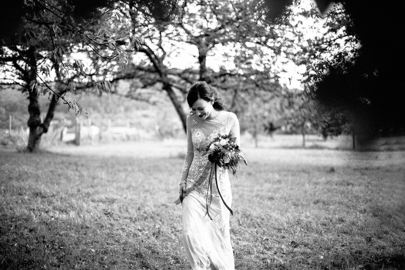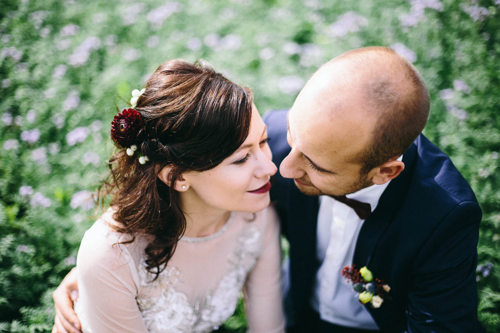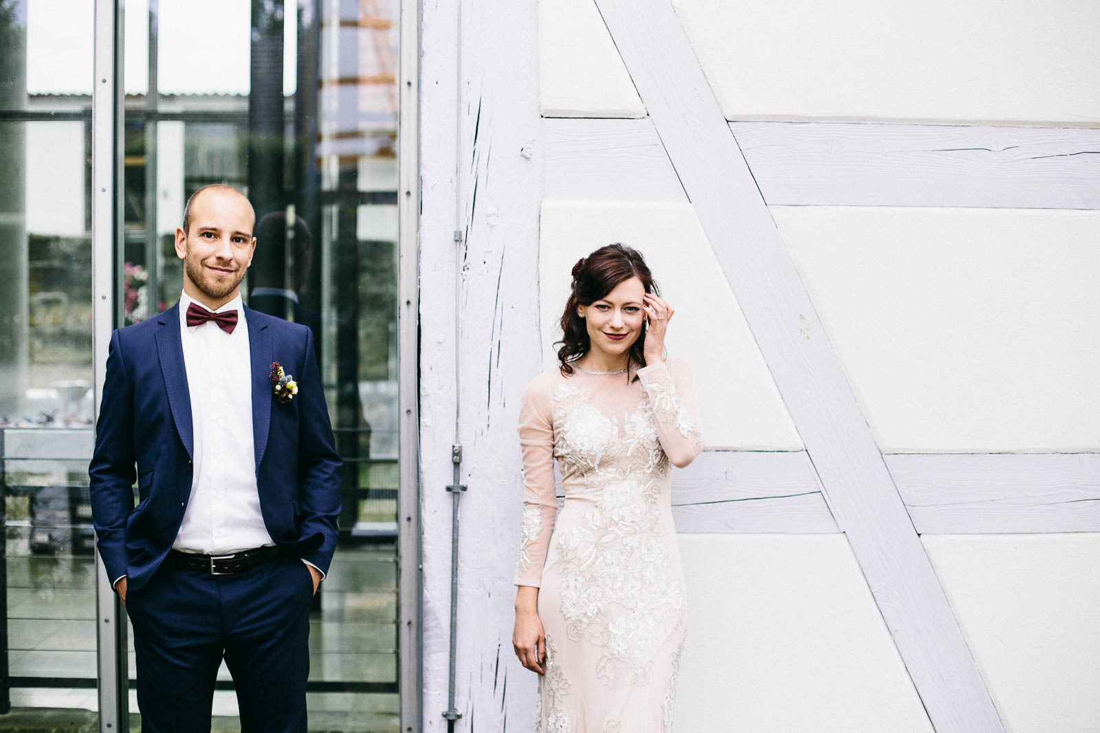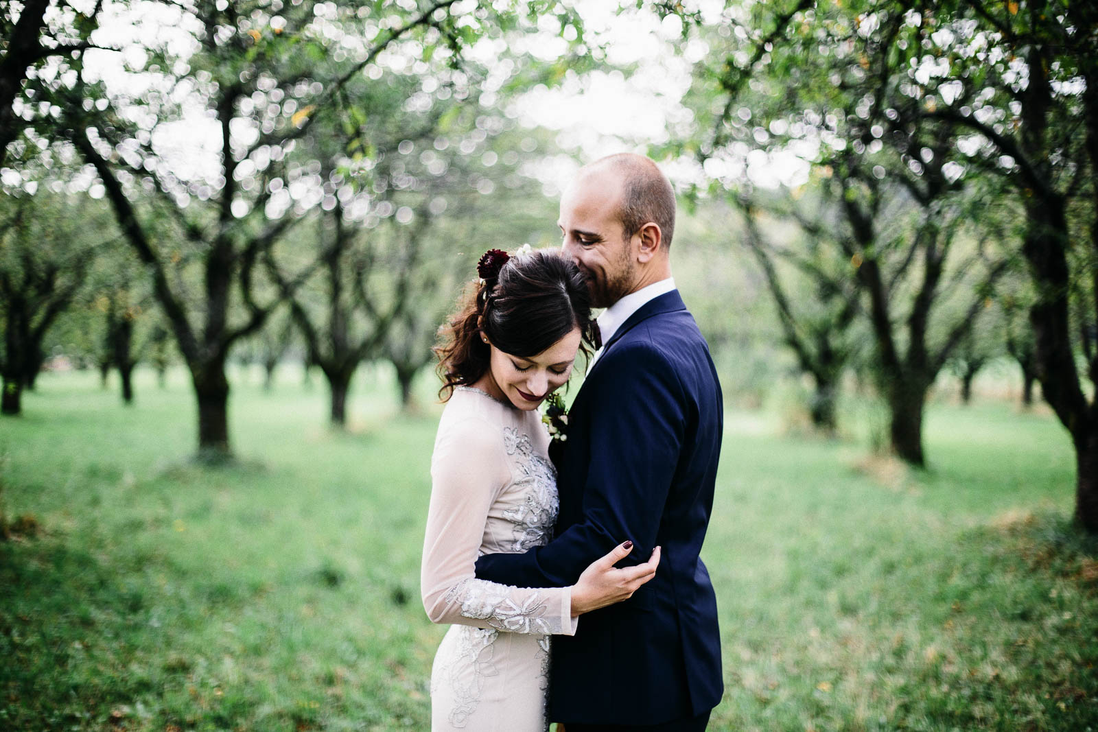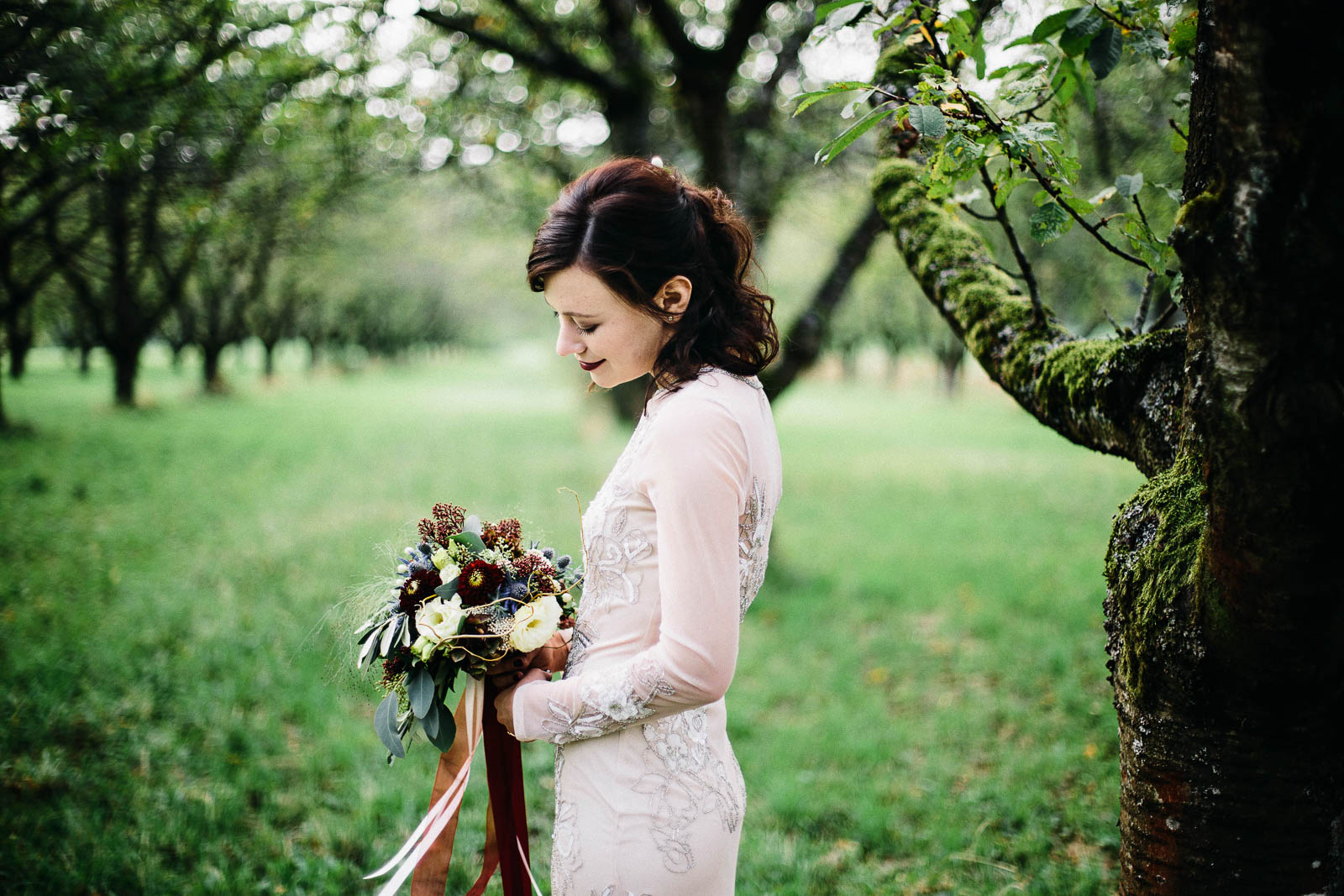 Ein Hochzeitsshooting mit Hund stellt einen vor gewisse Hürden: Das Brautkleid sollte natürlich sauber und am Besten in einem Stück bleiben, der Anzug zumindest bis zur Trauung frei von Pfotenabdrücken sein und das muss dem Tier möglichst sensibel erklärt werden. Aber ich ja bereits erwähnte: Wir waren so etwas wie Seelenverwandte und Bruno verstand einfach sofort, dass es hier auf ihn ankam. Es entstanden so unglaublich viele schöne Aufnahmen – und ich bin gespannt, wie sie euch gefallen. Immer mitten durch die Natur, kamen wir von einem Garten mit alten Apfelbäumen, zu einem Feld à la Provence (in Wirklichkeit war es einfach nur irgendein Unkraut, aber was soll’s), fanden riesige burgunderfarbene Ahornbäume und Sträucher am Wegesrand in herbstlichen Beerenfarben. Kurz um: Wir sind viel herumspaziert und haben alles mitgenommen, was unseren Weg gekreuzt hat. Zum einen natürlich, um Bruno bei Laune zu halten und zweiten (der wirkliche Grund) um den Herbst so richtig auszunutzen.