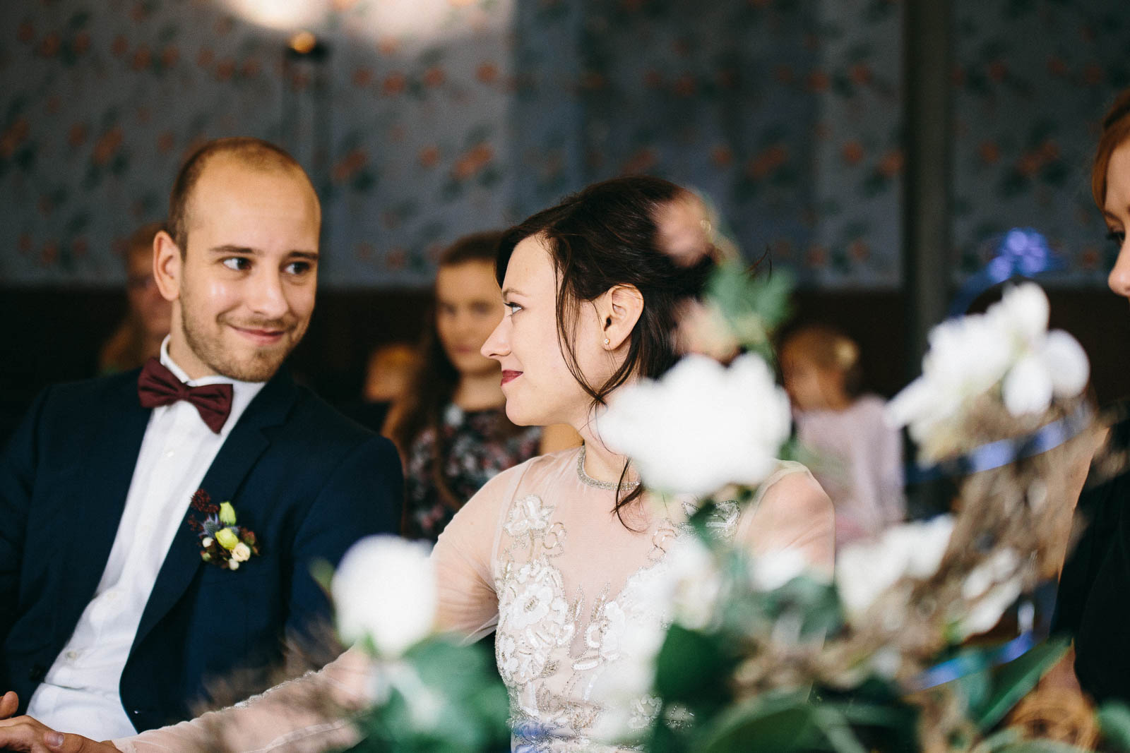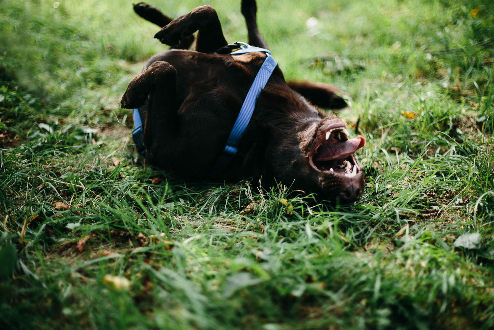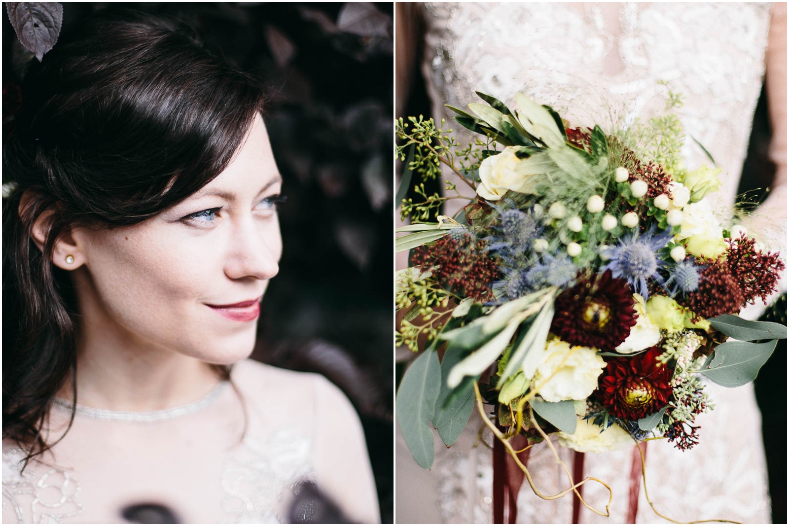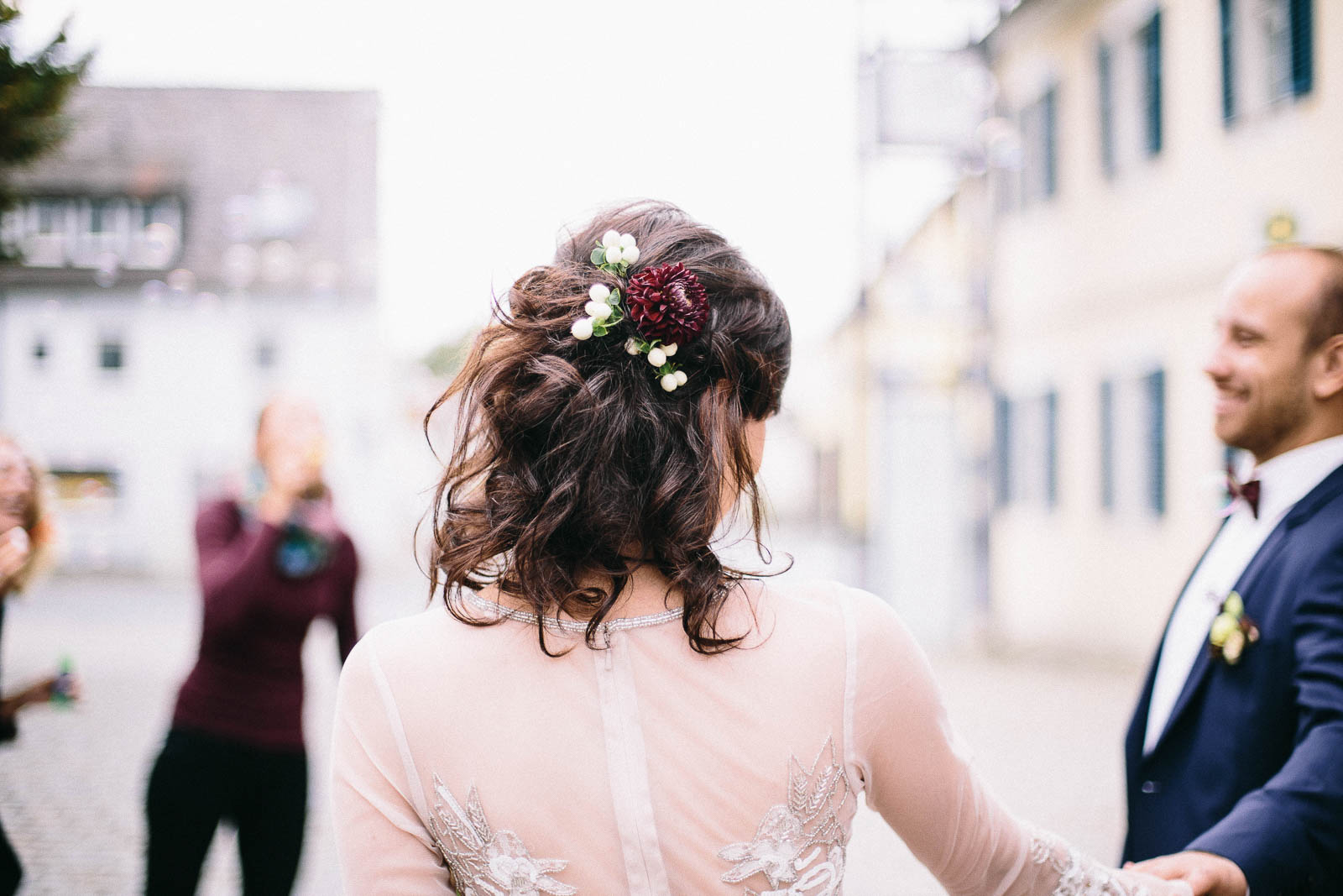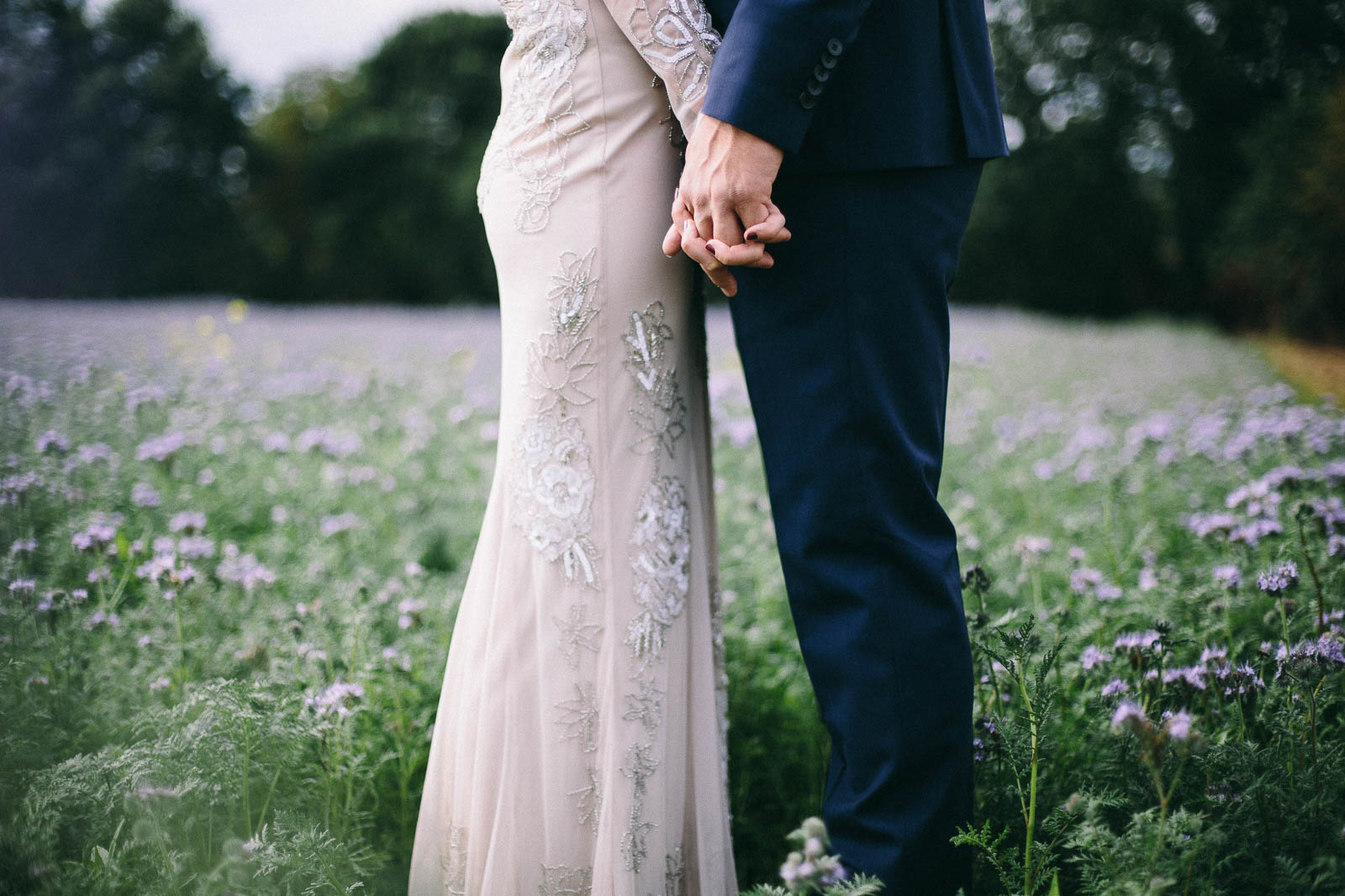 Ein Hochzeitsshooting mit Hund stellt einen vor gewisse Hürden: Das Brautkleid sollte natürlich sauber und am Besten in einem Stück bleiben, der Anzug zumindest bis zur Trauung frei von Pfotenabdrücken sein und das muss dem Tier möglichst sensibel erklärt werden. Aber ich ja bereits erwähnte: Wir waren so etwas wie Seelenverwandte und Bruno verstand einfach sofort, dass es hier auf ihn ankam. Es entstanden so unglaublich viele schöne Aufnahmen – und ich bin gespannt, wie sie euch gefallen. Immer mitten durch die Natur, kamen wir von einem Garten mit alten Apfelbäumen, zu einem Feld à la Provence (in Wirklichkeit war es einfach nur irgendein Unkraut, aber was soll’s), fanden riesige burgunderfarbene Ahornbäume und Sträucher am Wegesrand in herbstlichen Beerenfarben. Kurz um: Wir sind viel herumspaziert und haben alles mitgenommen, was unseren Weg gekreuzt hat. Zum einen natürlich, um Bruno bei Laune zu halten und zweiten (der wirkliche Grund) um den Herbst so richtig auszunutzen.