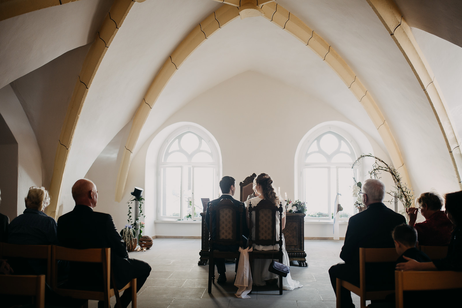 Bei der Trauung in Pirna liefen Beide zu Ludovico Einaudi ein - und bei mir liefen dafür die Tränen. Ich liebe Einaudi, da bin ich machtlos. Danach fuhren wir alle zur Location (auf der 40- minütigen Fahrt wurde ich vom Brautpapa mit allerlei nützlichen Informationen zu Land und Leuten versorgt), vorbei an einer wirklich wunderschönen Frühlingslandschaft, blühenden Zweigen am Straßenrand und beeindruckenden Felsformationen in der Ferne. Die Burg Schöna liegt ganz malerisch auf einem kleinem Hügel - innen ganz gemütlich und liebvoll eingerichtet - der Garten wie ein kleines Paradies voller wilder Blumen und alter Bäume. Es muss auch nicht immer das pompöse Fest und das gigantische Catering sein: Hier haben alle gemeinschaftlich zusammengeholfen, jeder hat einen Kuchen gebacken und mitgebracht, die leckere Kürbissuppe hatte Laura selber gekocht. So saßen wir alle ganz einträglich beieinander, quatschten und gesungen wurde selbstverständlich auch. Da könnte man glatt vergessen, dass man eigentlich die Fremde ist.