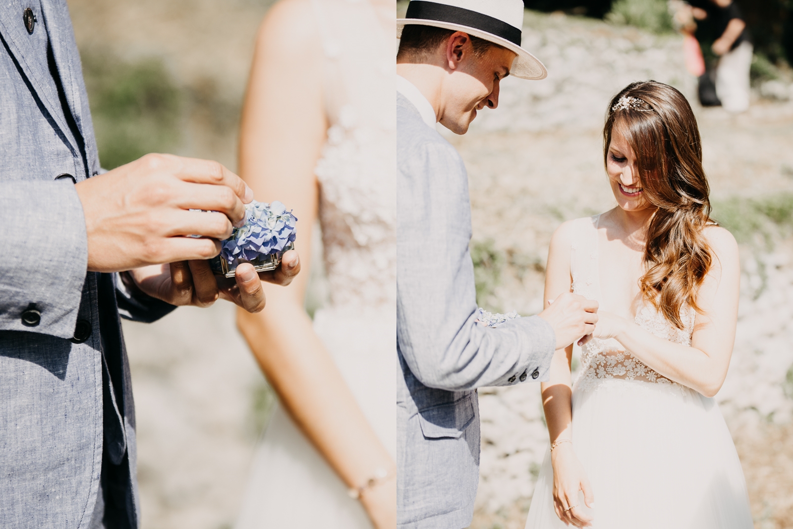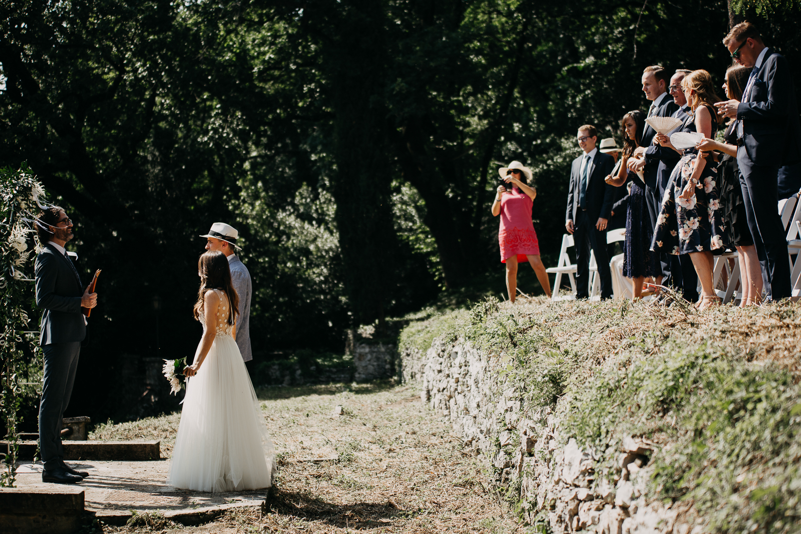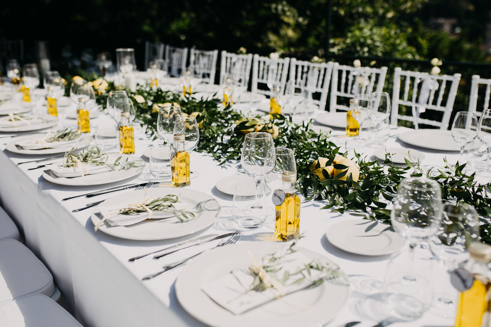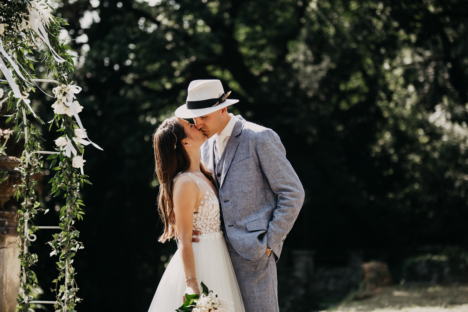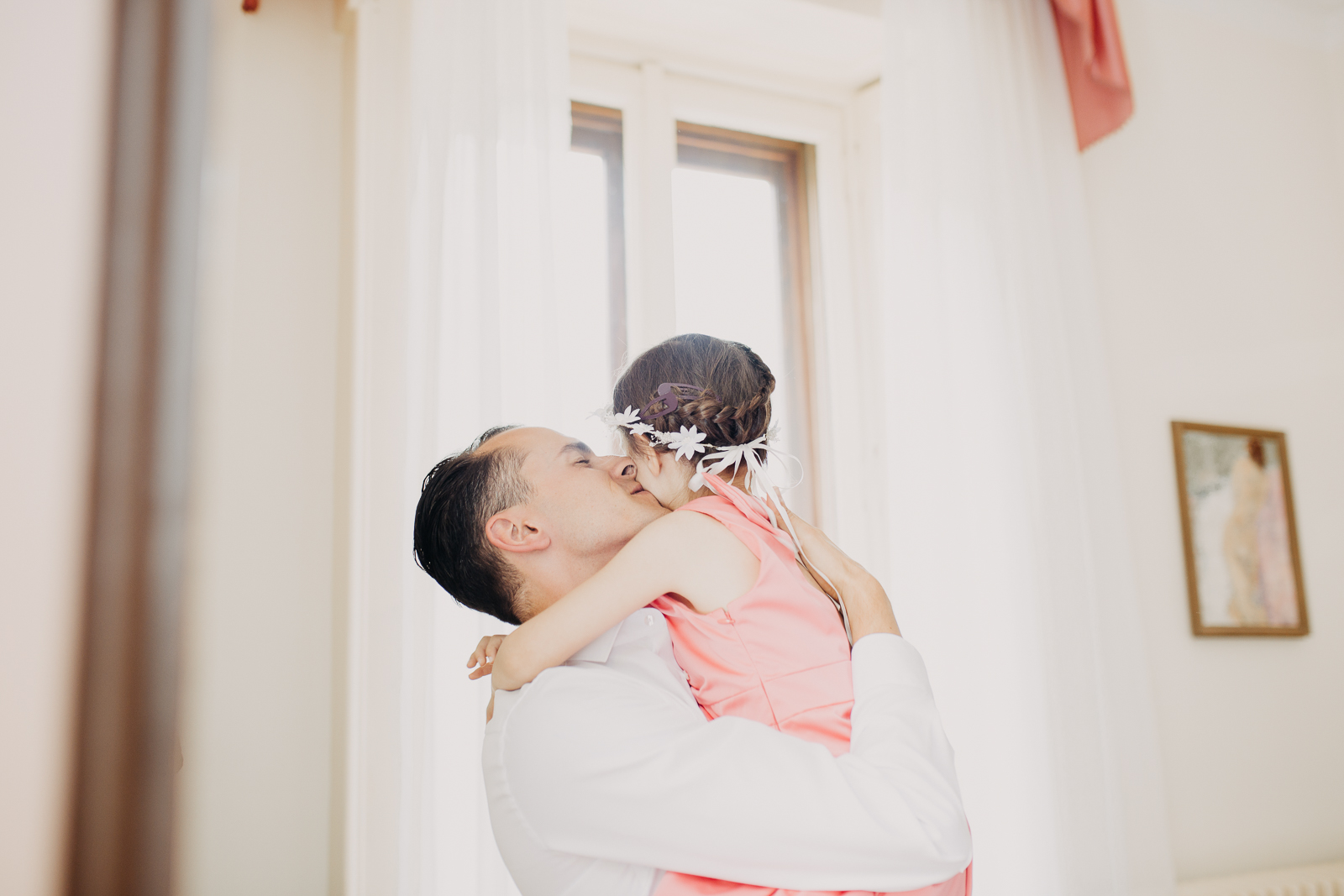 Als ich mit meinem kleinem mintfarbenen Adam nach langer Reise endlich in dem kleinem italienischen Örtchen ankomme, sind die defekte Klimaanlage, Stau und mein untreues Navigationsgerät sofort vergessen: Italien hat mich. Ab der ersten Sekunde. Das passiert mir jedes Mal und ich glaube, es ist das Licht. Diese ganz italieneigene Lichtfarbe, das mit seiner Wärme und seinen Lichtspielen jeden Ort verzaubert. Gleich am ersten Abend gab es mit allen Gästen in einer Taverne ein großes gemeinsames Abendessen und wer sich bis dahin noch nicht kannte, hatte diese kleine unerhebliche Lücke beim Zubettgehen bereits geschlossen. Die Location, die sich Vanessa und Micha ausgesucht hatten, hat mir einmal komplett die Sprache verschlagen und – es war schlicht gesagt wunderschön dort. Die engsten Familienmitglieder haben alle dort zusammen das Wochenende verbracht, am Tag der Hochzeit selbst fand einfach alles draußen statt: die freie Trauung, das Abendessen und auch die Tanzfläche war unter freiem Himmel.