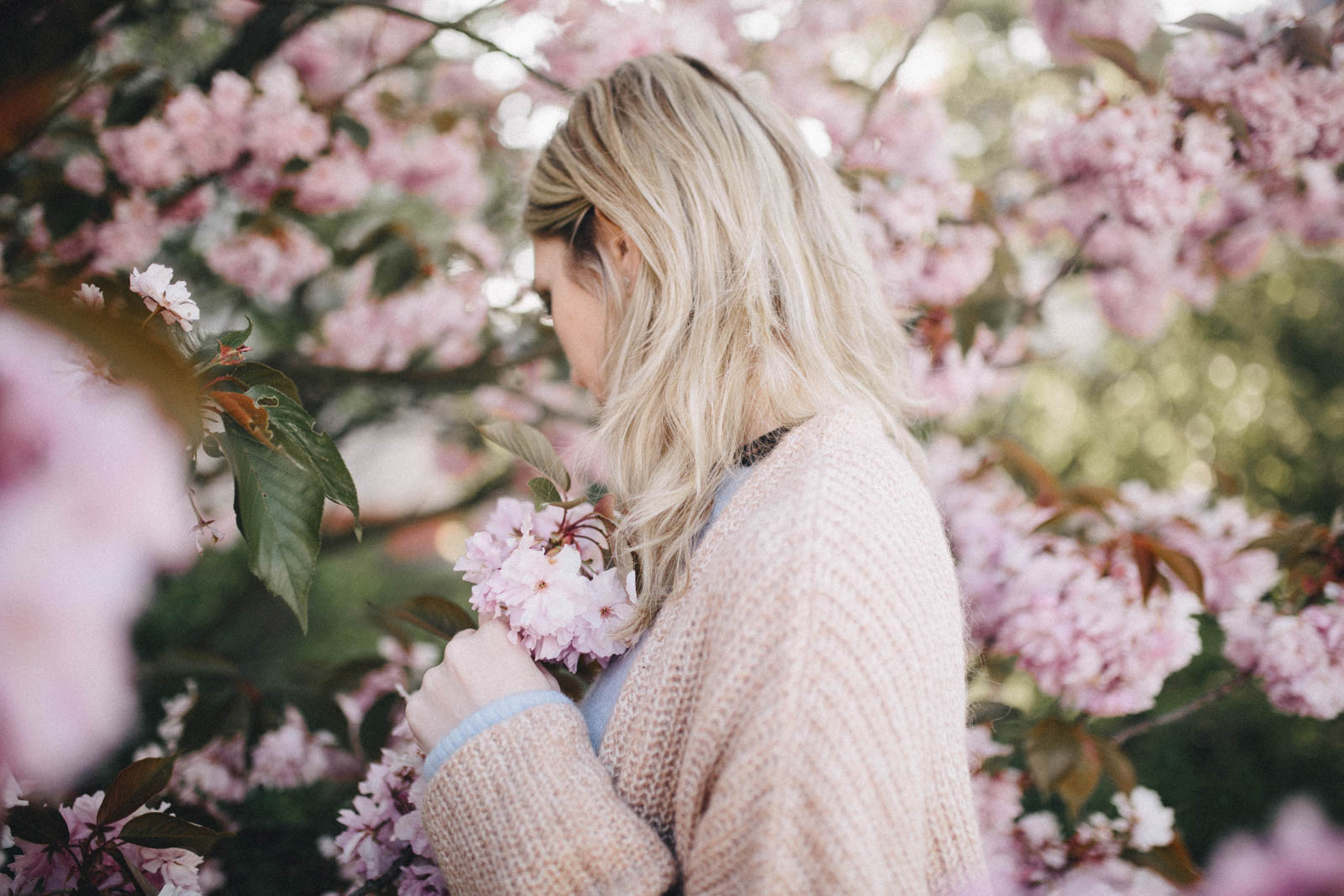 Noch ehe mein linker Zeigefinger auf den kleinen schwarzen Auslöseknopf tippen konnte, dreht sie sich in einer leichten Drehung von mir weg. Durch den Sucher sehe ich sie – genauer gesagt ihren Rücken – zwischen den rosagefärbten Blüten stehen, den Blick von mir abgewandt – und während ich nur eine Zehntelsekunde später das so vertraute Auslösegeräusch vernehme, muss ich gleichzeitig lächeln.
