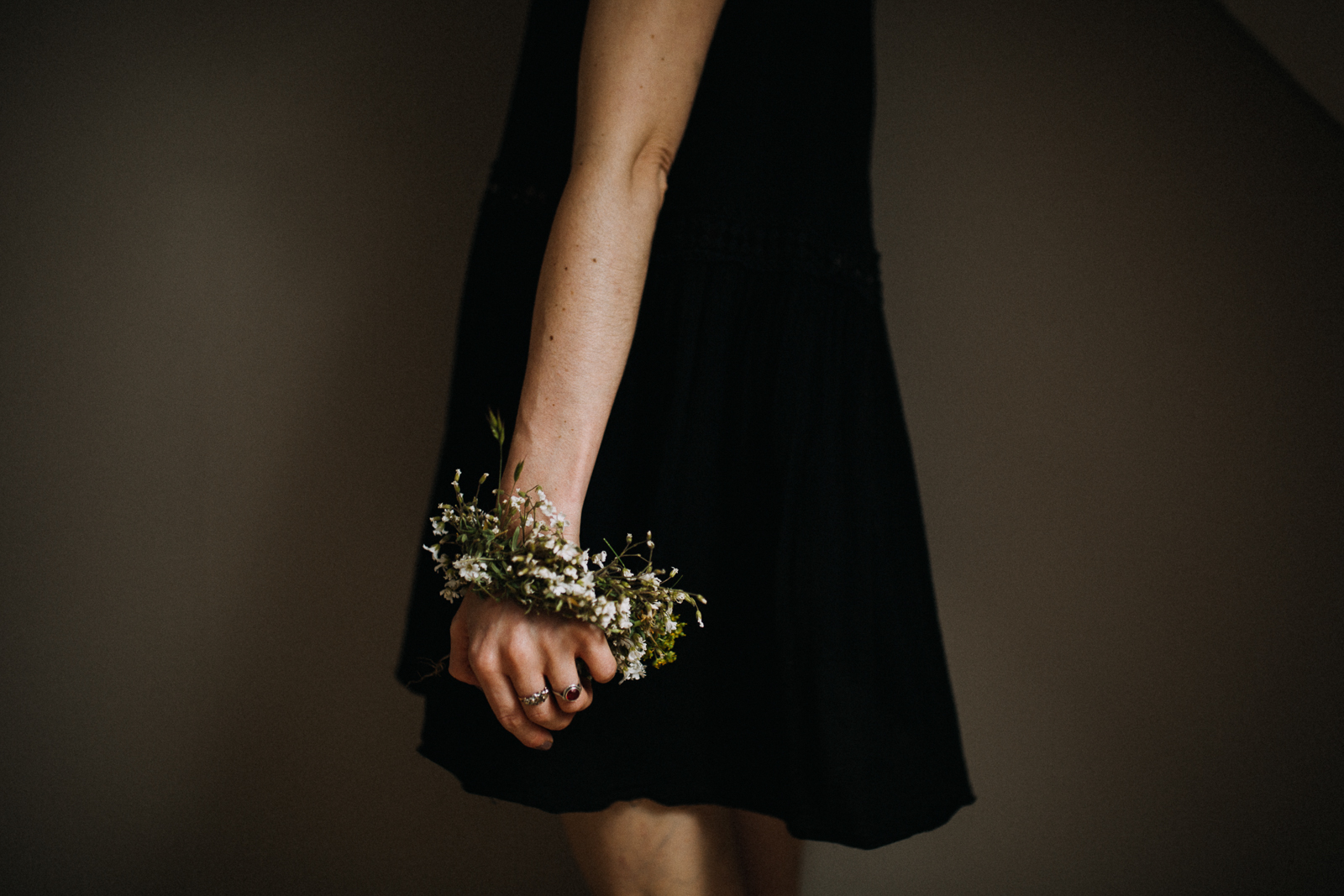 Aber es bedeutet auch, dass die Uhr rast. Die Wochen verfliegen – zusammen mit den Löwenzahnpiloten in die Ferne. Wohin auch immer und waren nie mehr gesehen. Und das bedeutet noch eines: Man muss lernen stehenzubleiben. Und es ertragen. Die Läufer verstehen, wie schwer das sein kann. Ich bin noch nicht besonders gut im stehen bleiben. Aber für die letzten Tage im Mai, da nehme ich es mir fest vor. Ich fange ganz klein an. Ich werde meinen Kaffee draußen trinken. Nicht vor dem Computer und dabei die E-Mails abrufen. Den Wolkenhimmel schaue ich mir von unten an, mache ein Foto und schicke es meiner Omi, die vor zwei Tagen ihren Bruder verloren hat. Ein Monat der Abschiede. Und ich werde lernen, Blumenarmänder zu binden. So wie dieses hier, das mir meine Kundin am Sonntag nach dem Shooting geschenkt hat. Ich brauche schließlich auch noch ein kleines Abschiedsgeschenk.