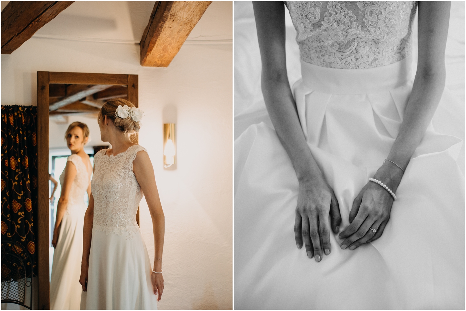Noch nicht wirklich wach und mit einem leichten Kater setze ich den Blinker, als ich am Samstagmorgen auf den Besucherparkplatz von Schloss Reichenschwand einbiege. Während ich mit einem Kaffeebecher to Go in der Linken und mit der rechten Hand meine Kameratasche auf die Schulter hieve, blicke ich mich suchend um. Von einem Schloss sehe ich erstmal auf den ersten Blick nichts. Gut, denke ich mir. Sollte sich ja dennoch relativ leicht finden lassen, so ein Schloss und laufe los. Nina und Edi hatte ich schon im Juli zu ihrer standesamtlichen Hochzeit begleitet. Da einiges an schwedischer, italienischer und amerikanischer Verwandtschaft angereist kam, gab es am Tag vor der Hochzeit noch ein kleines Get together. Würstchen vom Grill, Flamingo im Pool und einigen Gläschen Wein. Den spüre ich heute auch noch ein wenig. Wenn schon, dann halt eben richtig – so oder so ähnlich erinnere ich mich an Ninas Worte. In dem Moment laufe ich durch ein verziertes schmiedeeisernes Tor und blicke direkt auf Schloss Reichenschwand. Während ich mit knirschenden Schritten die geschotterte Auffahrt dem wunderschönen und neu restaurierten Gebäude entgegenlaufe laufe, zweifle ich keine Sekunde mehr an ihren Worten.