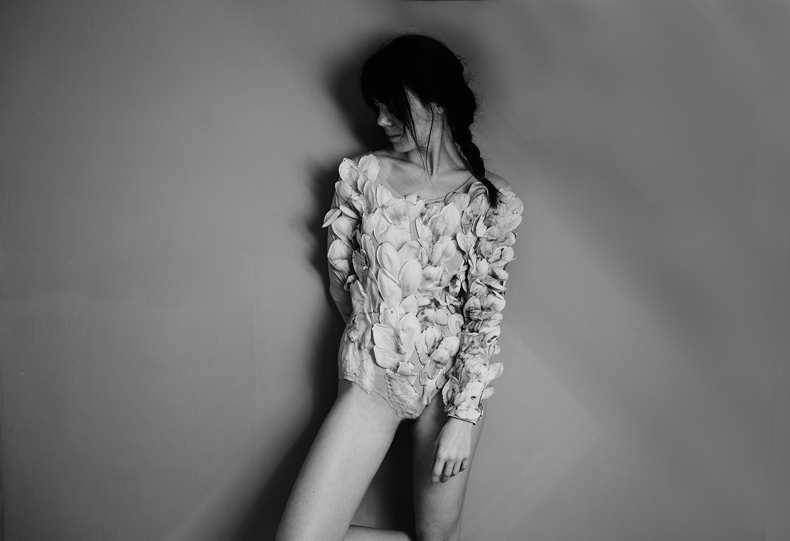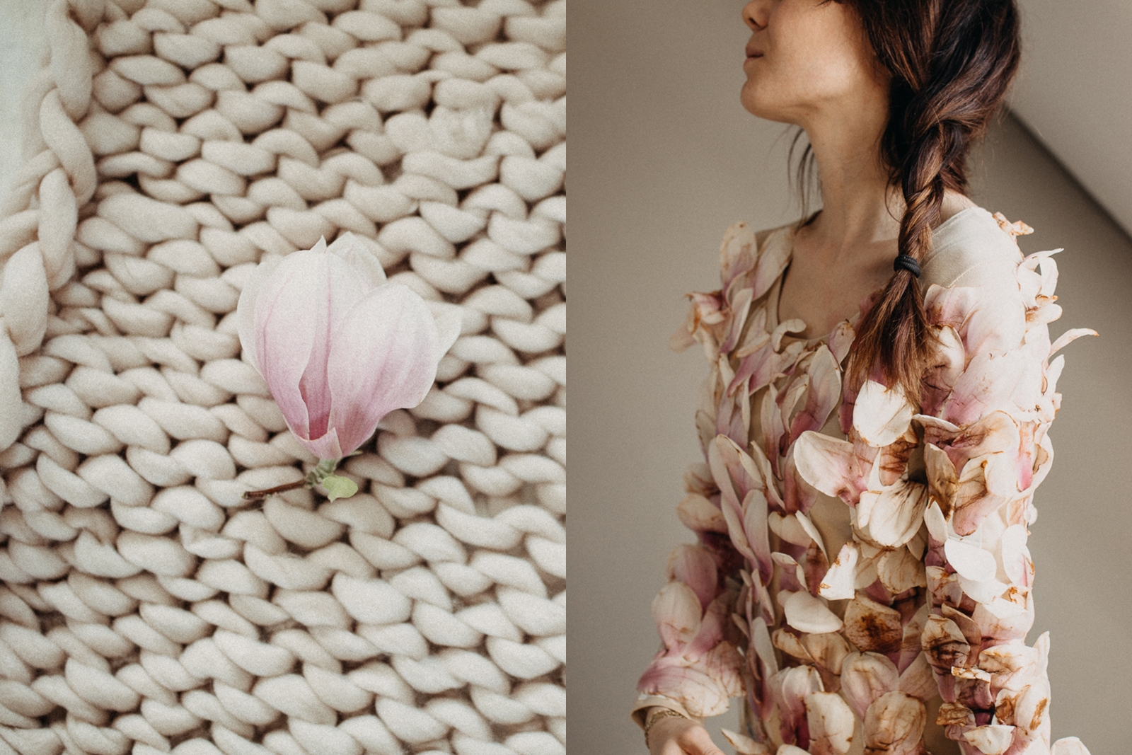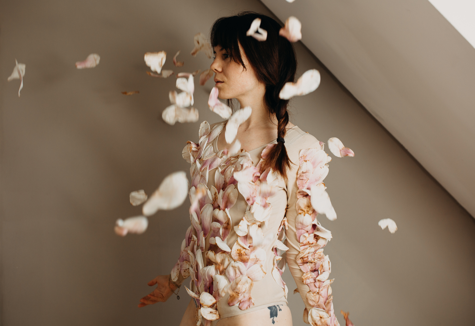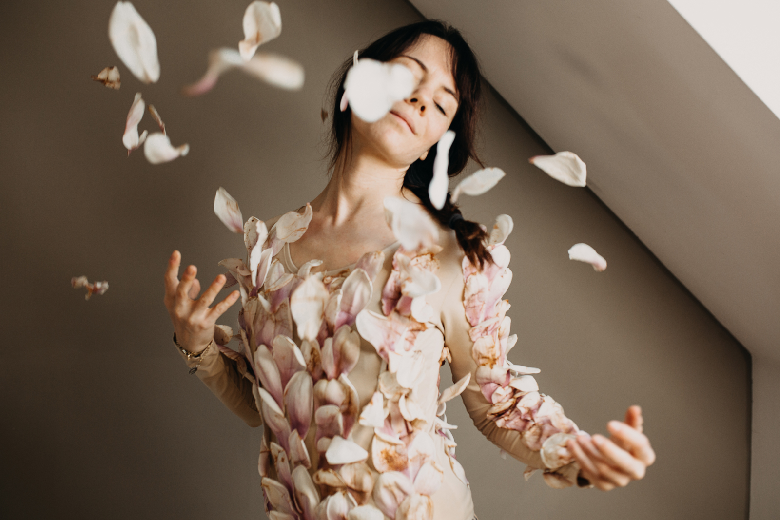 Da knie ich ich also nun an diesem Montagmorgen auf dem Aspalt und sammle die gesammelte Schönheit blumifizierter Vergänglichkeit auf. Ich sammle einen ganzen Eimer voll und erfreue sämtliche Nachbarn in meiner Straße, weil ich ihnen netterweise Arbeit erspare. Der Grund ist: Eine Idee, die ich schon lange im Kopf hatte. Ein letzter würdevoller Auftritt. Und so beklebe ich einen kompletten Body – ehrlich gesagt bin ich ziemlich überrascht, wie gut mein Plan funktioniert. Nur eine halbe Stunde später und nach einigen Schlangenmensch ähnlichen Verrenkungen, um in diesen ziemlich fragilen Body zu gelangen, blicke ich in den Spiegel und freue mich. Über mein Magnolienkunstwerk. Den Frühling. Die Schönheit der Natur. Dass die Winterjacken nun endültig nicht mehr gebraucht werden. Ich freue mich über diesen Moment. Das Jetzt.